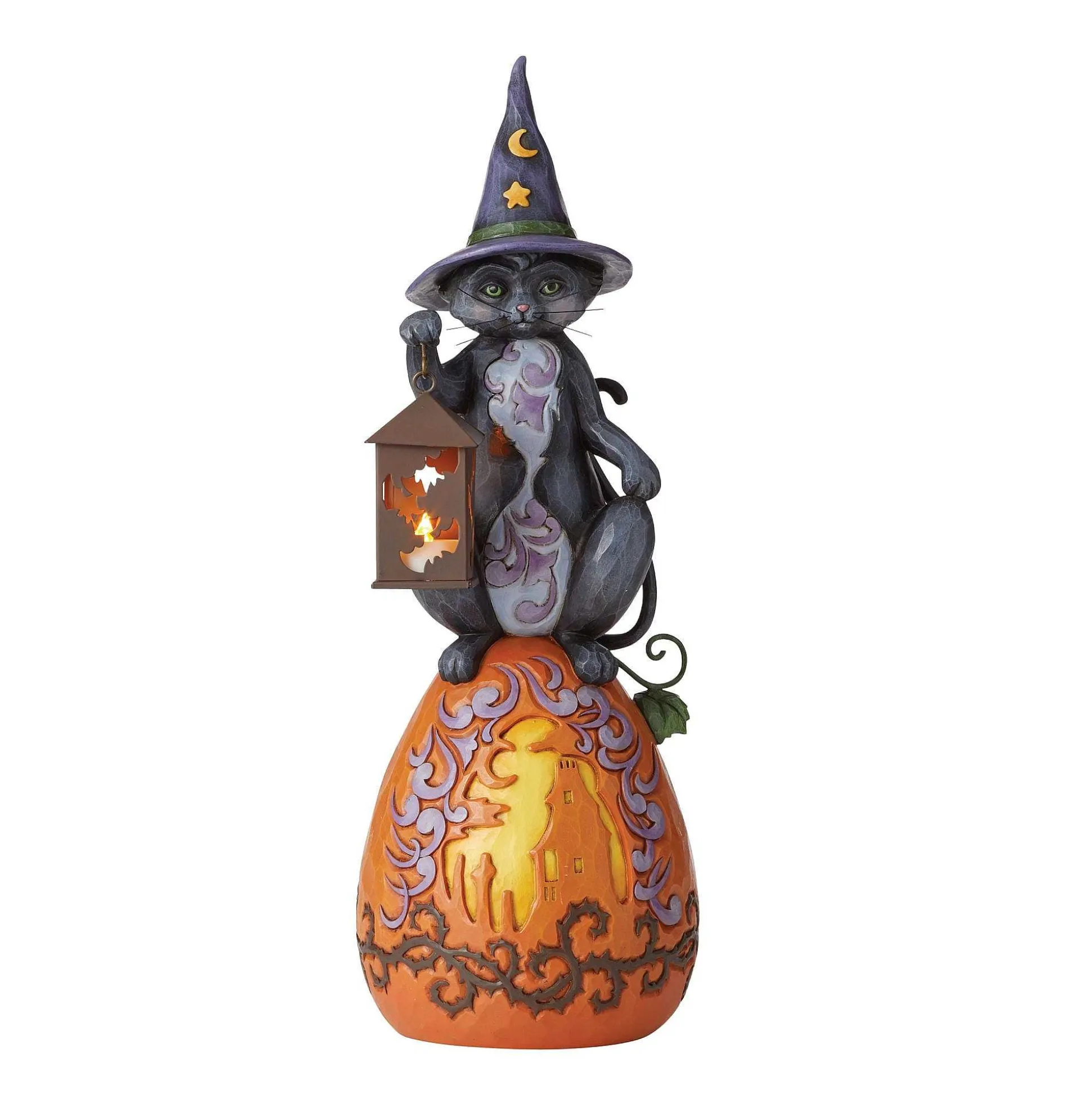 Balancing On A Intricately Carved Pumpkin, This Mysterious Jim Shore Cat Wears A Sorcerer’s Hat And Holds A Lantern. The Rosemaled Pumpkin Carving Reveals A Silhouette Of A Haunted House, While The Cat’s Working Lantern Shines Through Bat Cutouts.