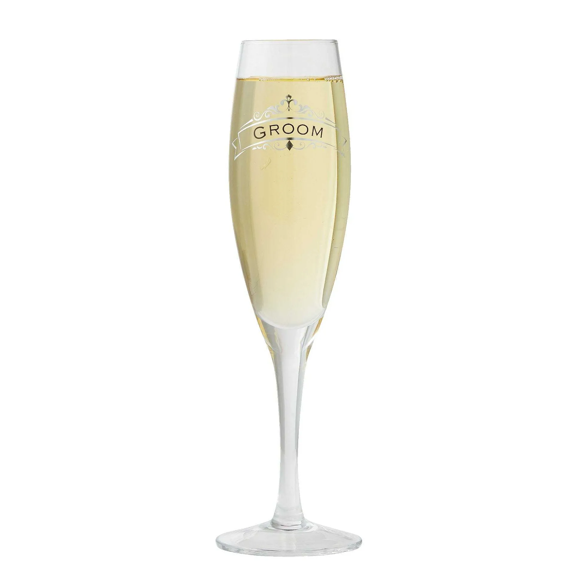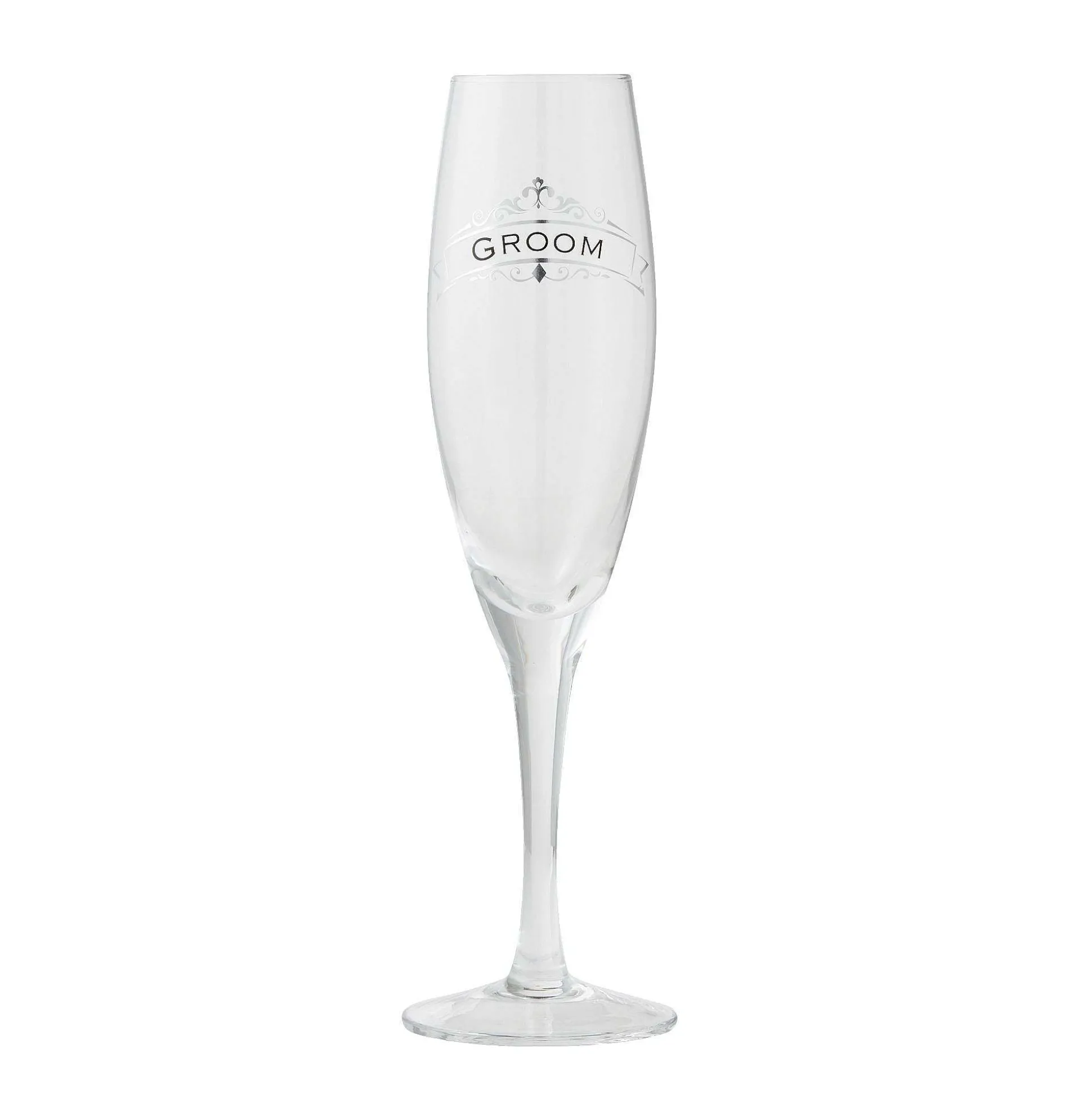 This Elegant Groom Toasting Glass Is Mouth Blown For Superior Clarity And Shine. The Intricate Detail Is Done In A Silver Mirror Finish. Handwash Only. Glass Is Engravable.