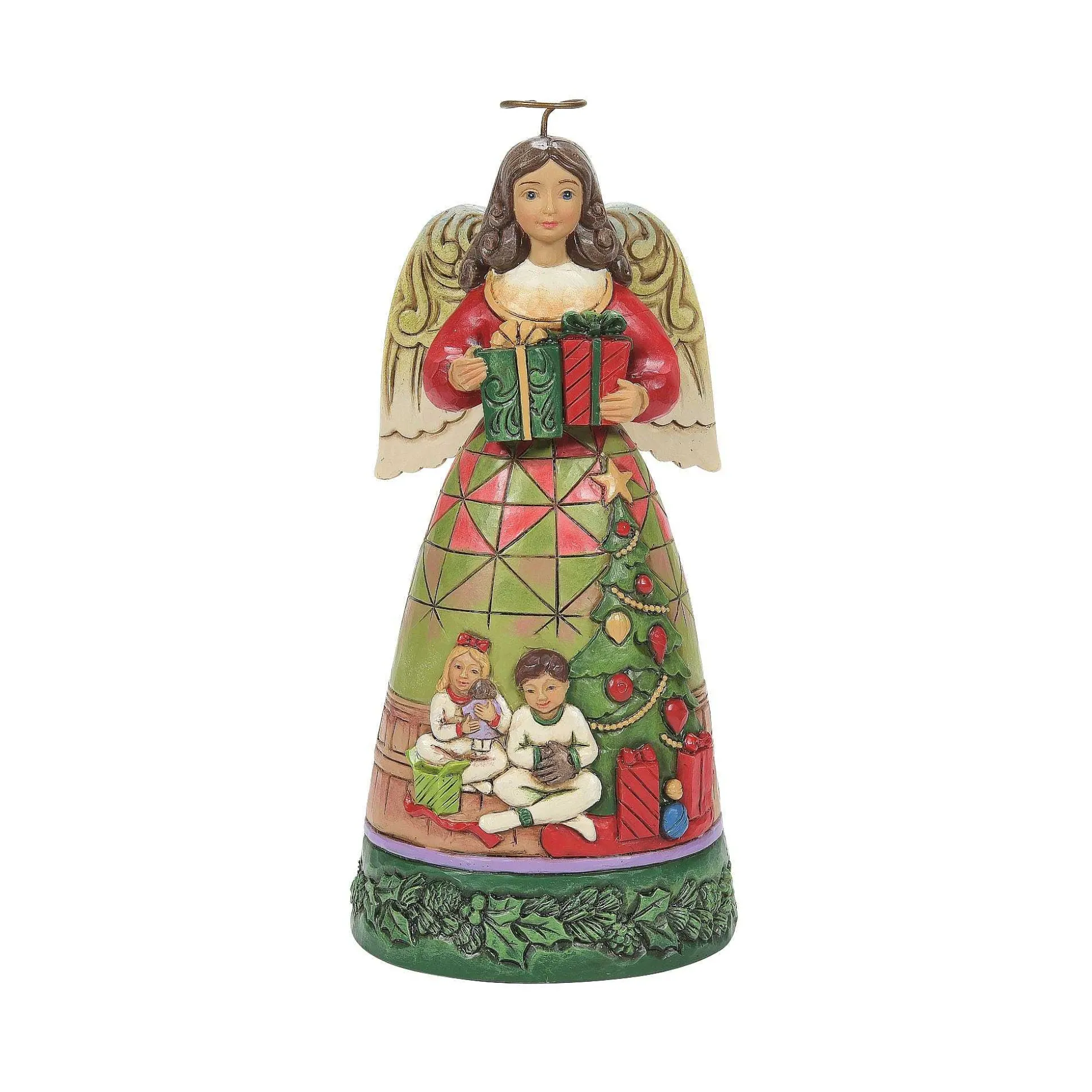 This Graceful Christmas Angel Illustrates The Joy Of Christmas Day. In Marvelous Greens And Reds, She Holds Two Prettily Packaged Presents In Her Hands While Her Gown Reveals A Scene Of Two Children Unwrapping Gifts. She Smiles Sweetly, Standing 6″.