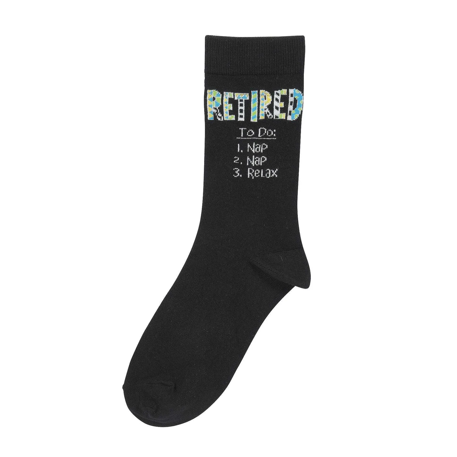 These Socks Rock! Wear Them With The Great Esteem That Only Comes From Being Retired. With A Colorful Title, These Black Knit Socks Outline An Important To Do List That Involves Napping And Relaxation. Excel In Foot Fashion With This Proud Pair.