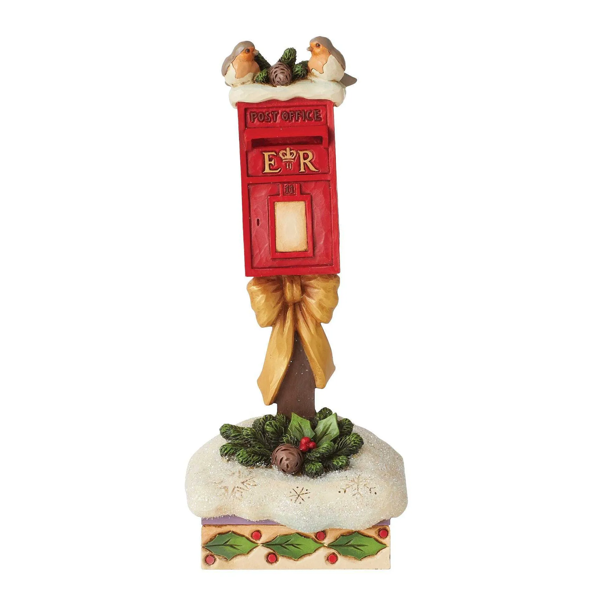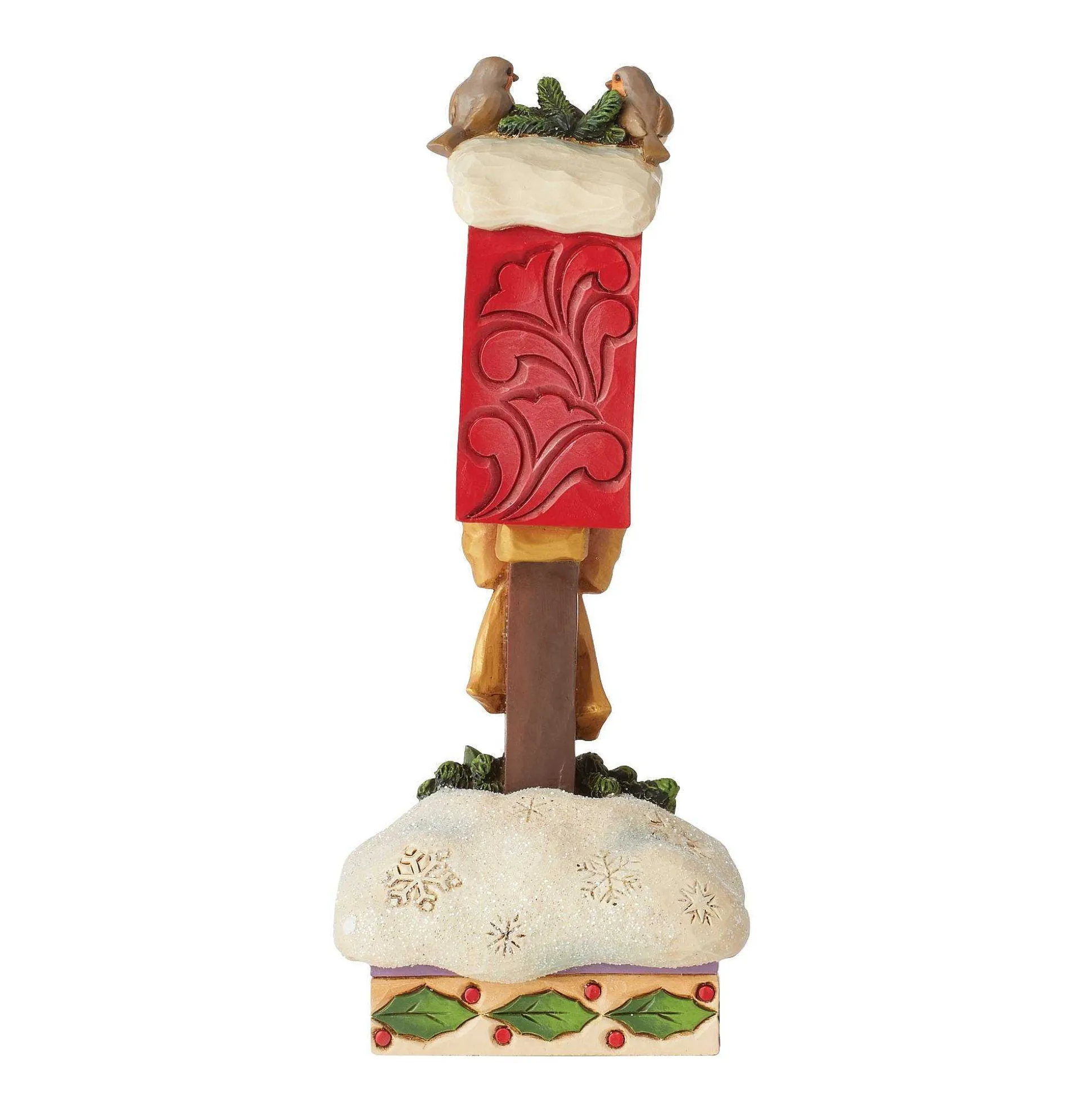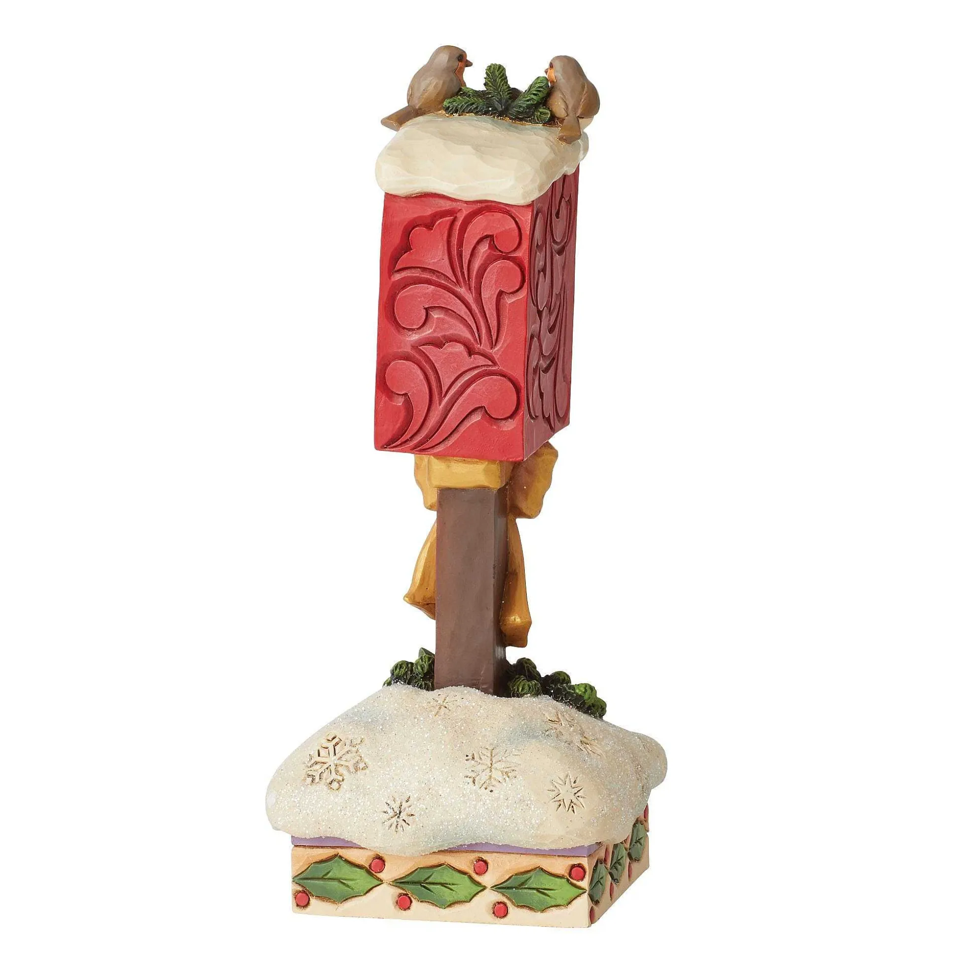 This Peaceful Jim Shore Figurine Features A Post Office Collection Box Decorated For The Season. With A Large Bow And Poinsettia Outfitted Wreath, Snowflakes Pattern The Box’s Snow Base. Two Birds Sit A Top The Box, Watching Deliveries Come And Go.