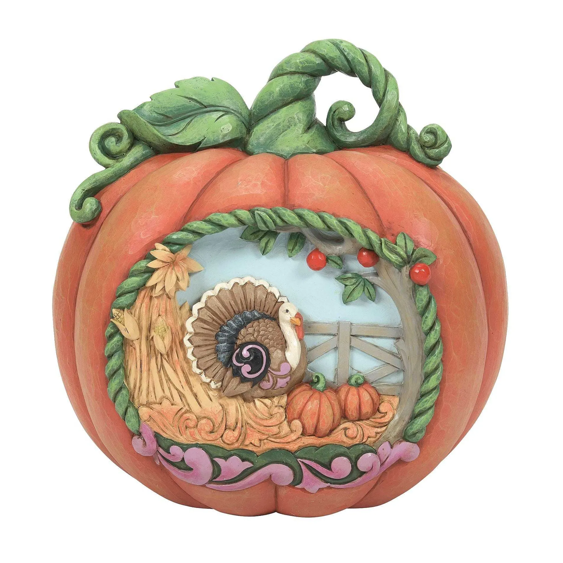 This Spectacularly Crafted Piece By Jim Shore Presents A Pumpkin To Prize. With A Braided Stump And Calligraphy Engraving, This Fall Figurine Reminds Us To Be Thankful. An Embossed Harvest Scene Showcases A Turkey In Lavish Color And Pattern.