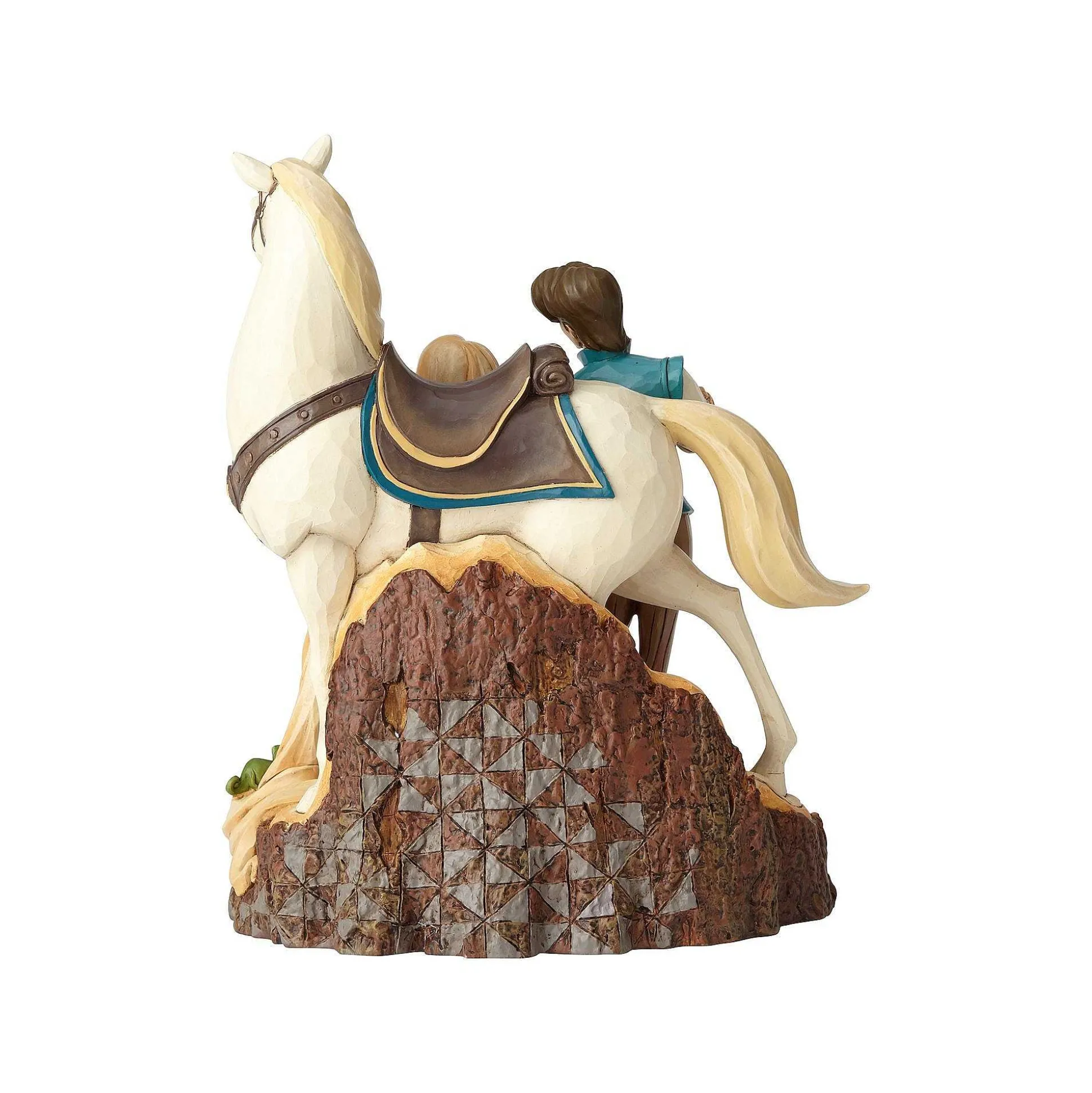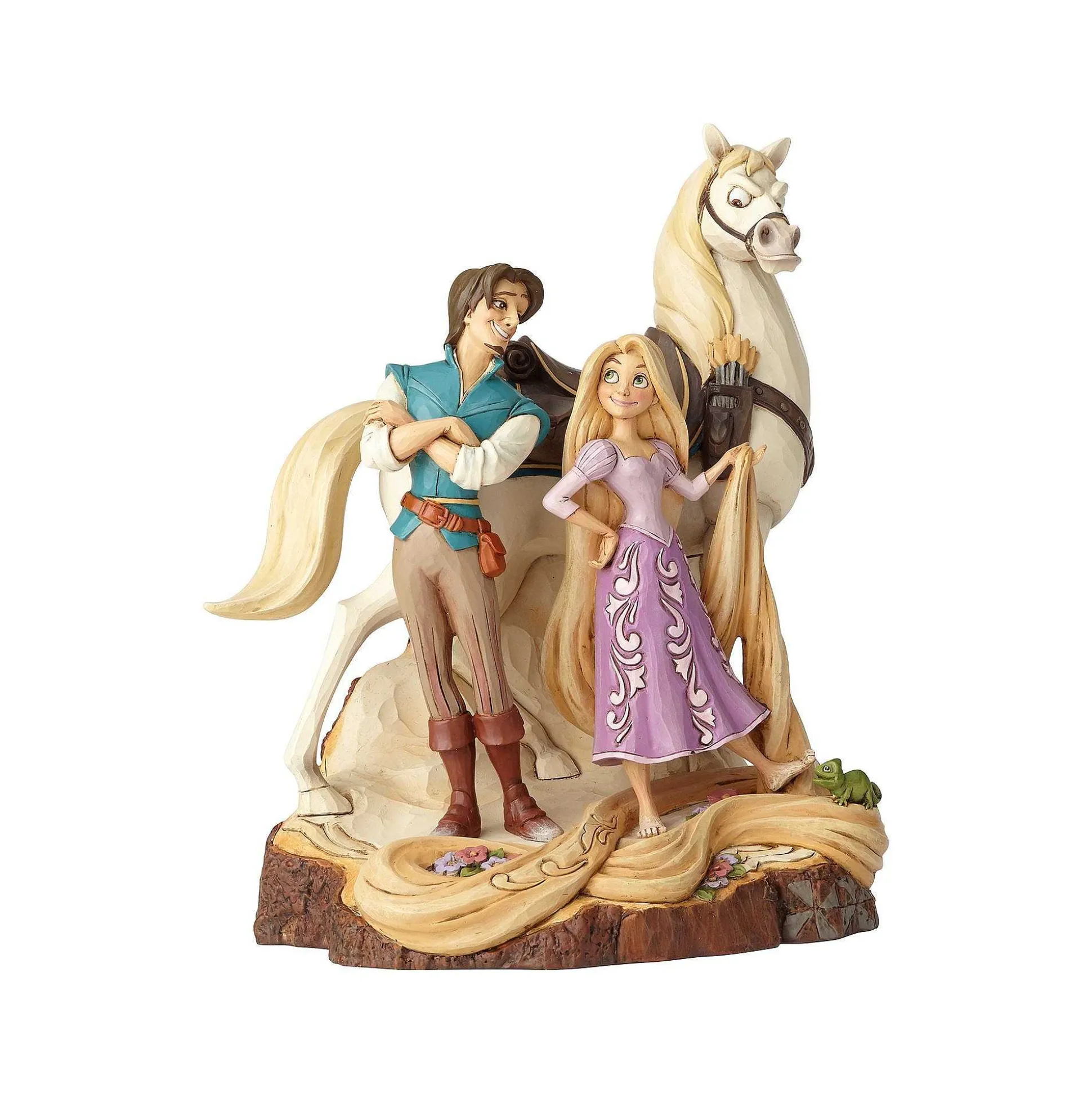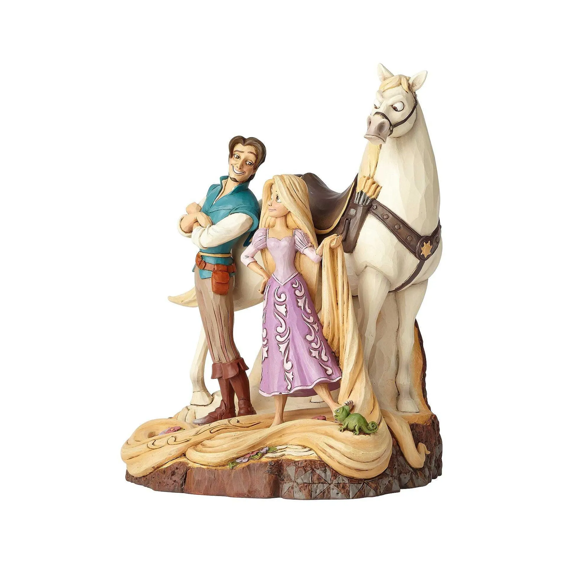This Beautifully Detailed Figurine Captures Flynn’s Signature Grin While Rapunzel, Wearing A Purple Gown Reimagined With Rosemaling Accents, Holds Up Her Flowing Locks And Maximus Sneers In The Background. The Hewn Log Base Adds To Its Enchanting Effect.